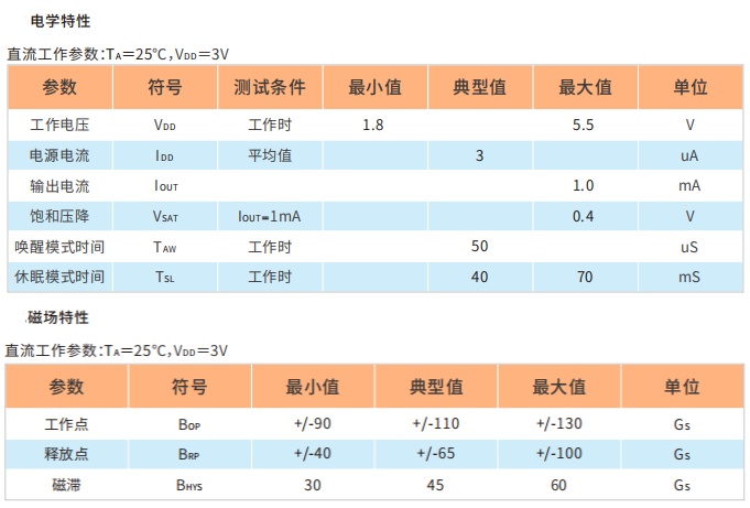 如果磁通密度⾼于“⼯作点”阈值或者低于“释放点”阈值,则开漏输出晶体管被驱动并锁存成与之相对应的状态。⽽在“休眠”周期中,输出晶体管被锁定在其先前的状态下。在电池供电应⽤中,这种设计对于延⻓⼯作寿命提供了最好⽀持。