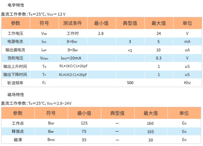 HAL1104是⼀款采⽤BCD⼯艺⽣产制作的单极型霍尔效应传感器,具备⾼灵敏度、⾼可靠性、⾼稳定性等优势。该产品内部集成了稳压电路、霍尔电压发⽣器、动态偏移补偿系统、施密特触发器、开漏输出等多个模块。⾼达47V的电源耐压与反向保护电路进⼀步提⾼了其可靠性。设计⽤于响应⼀个磁场:N极(SO)或S极(UA),当磁通密度(B)⼤于⼯作点(BOP)时,输出将打开(低),⽽磁通密度(B)⼩于释放点(BRP),输出关闭(⾼)。